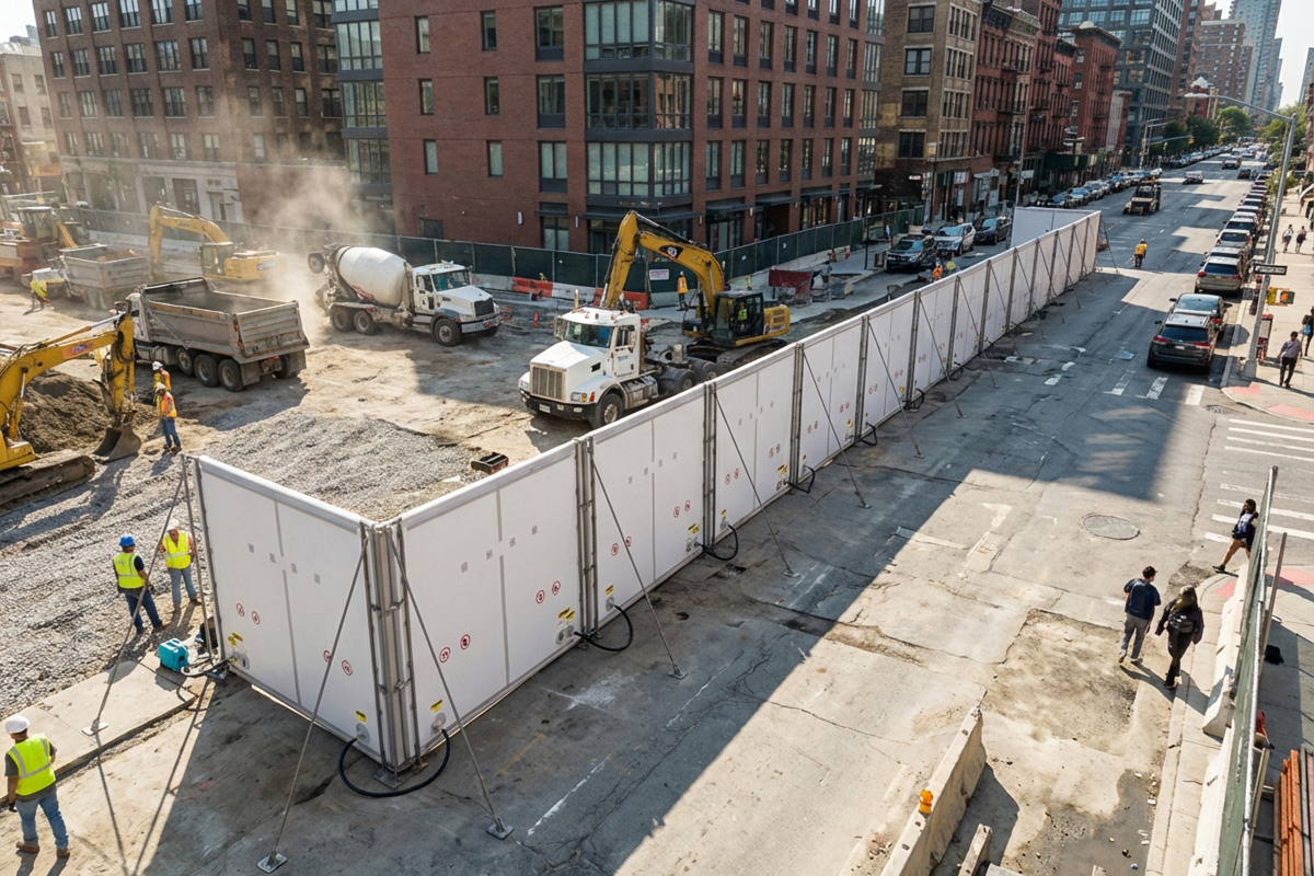 Las barreras acústicas móviles se utilizan en proyectos temporales de construcción e infraestructura en entornos en los que es necesario limitar la contaminación acústica hacia el área circundante.