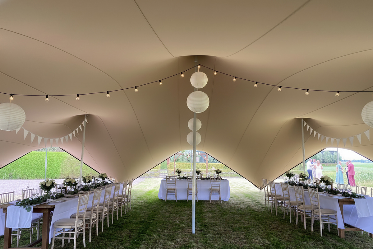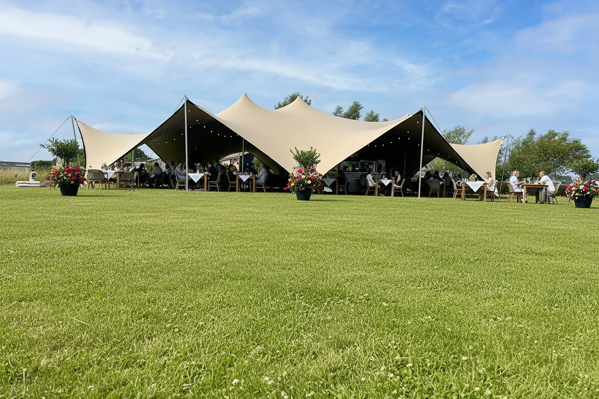 The Georgina stretch tent by Buitink Technology creates a warm and inviting setting for outdoor events. Its open design, stable construction and soft lighting bring a relaxed atmosphere that suits dinners, receptions and intimate gatherings perfectly.
