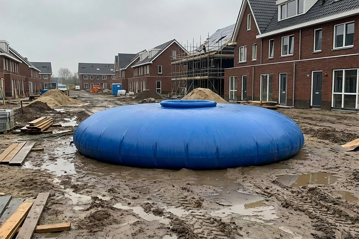 Naarmate het waterniveau in het reservoir stijgt, neemt het gewicht toe en wordt de opkisting stabieler. Het watergewicht zorgt voor een natuurlijke verankering op het maaiveld, vergelijkbaar met het principe van flexibele waterkeringen.